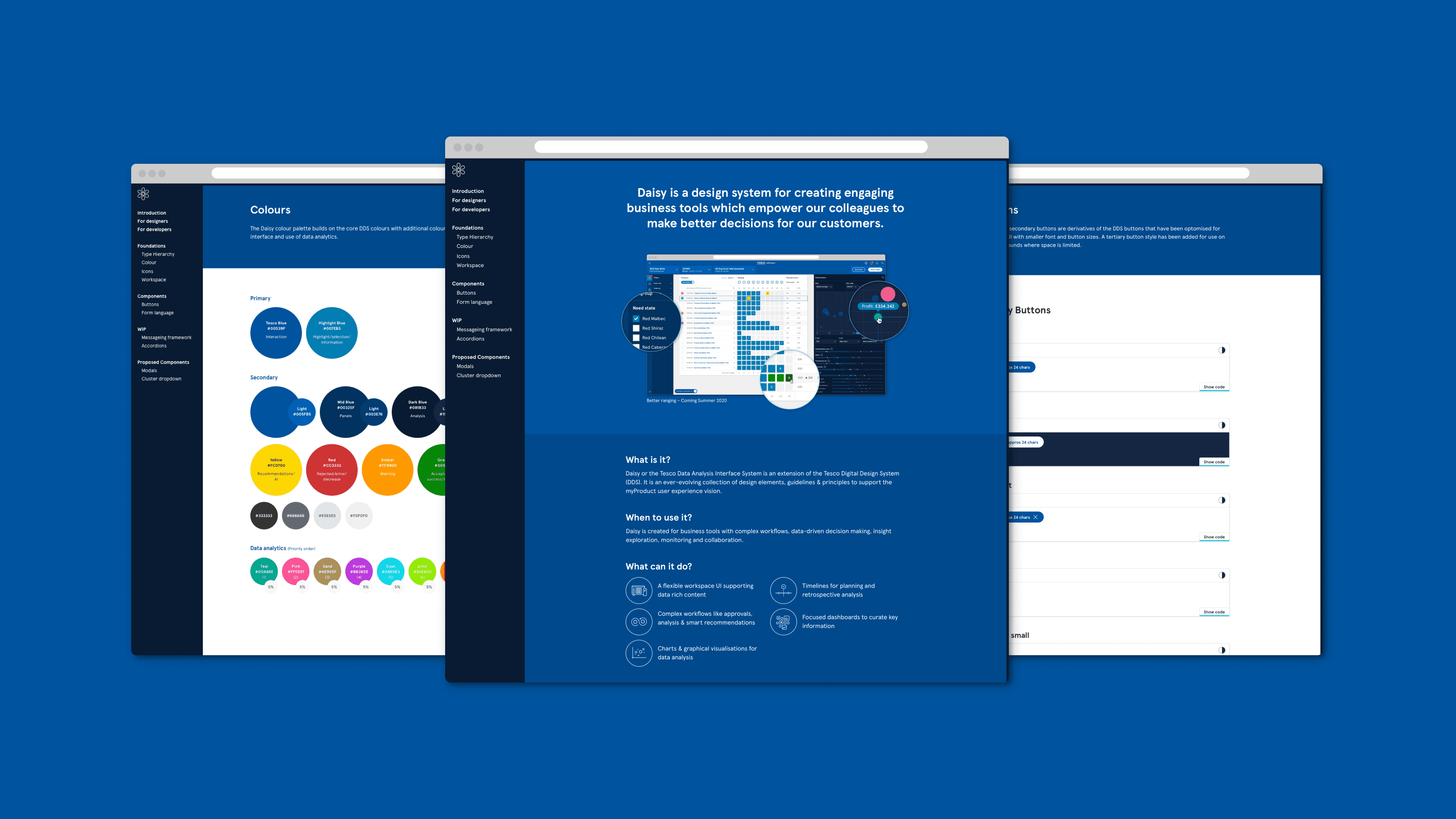 I created Daisy, iniitially standing for the Data Analysis Interface System. It would allow us to design elegant web applications which could cater for complex user flows with the ability for users to compare and analyse several data points at once. The name and mark took inspiration from the ‘flower’ product model diagram we had created.